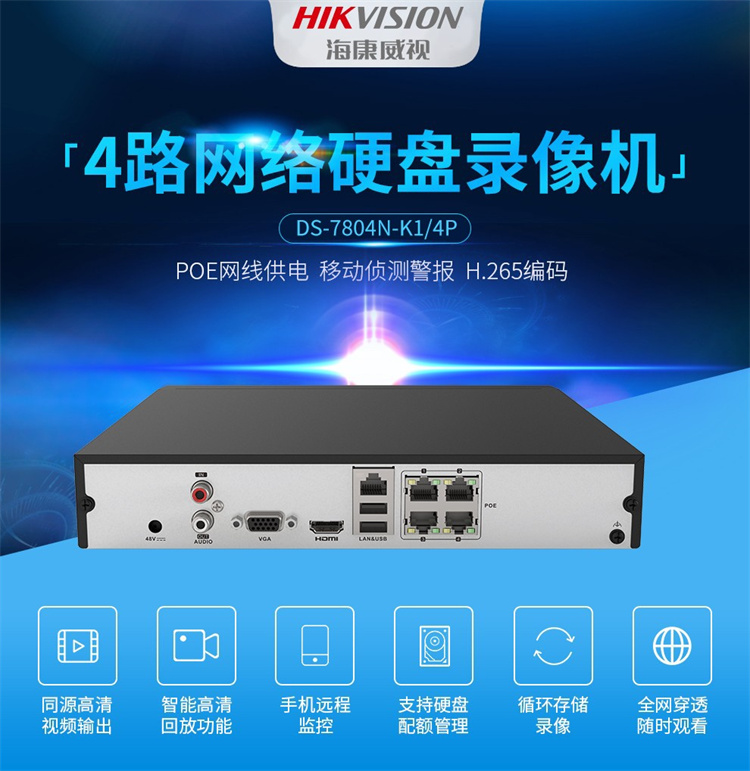 ??低?DS-7804N-K1/4P 海康威視網(wǎng)絡(luò)監(jiān)控硬盤錄像機4路POE網(wǎng)口 不帶硬盤