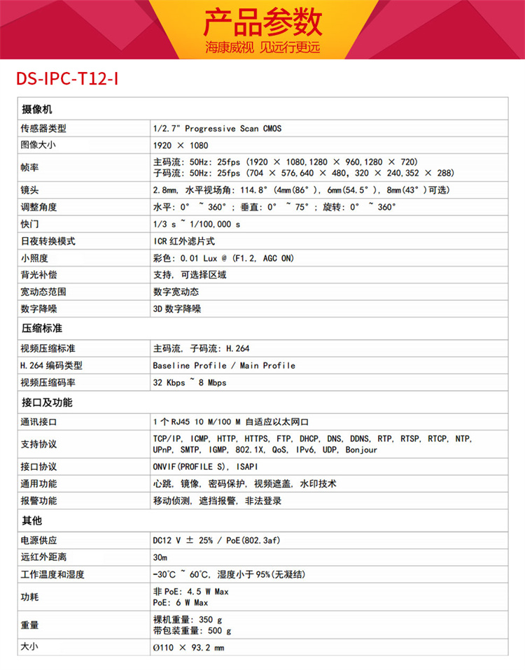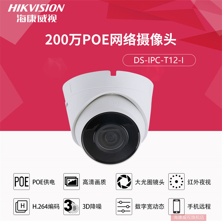 海康威視 T12-I 視頻監(jiān)控設(shè)備 ??低暰W(wǎng)絡(luò)監(jiān)控?cái)z像頭200萬(wàn)高清紅外夜視半球攝像機(jī)帶POE 官方標(biāo)配 2.8MM焦距